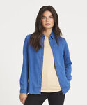 Classic long sleeve light weight denim shirt. Features include front button placket, button detail at cuffs and back yoke. Fashion fit. Turned hem with single needle stitch detail. Twin needle contrast stitching at side seams, sleeves and cuffs. Single needle contrast at armholes collar and front placket. 2 button placket at cuff. Modern narrow collar. Long sleeve. Yoke at back shoulder. No pockets for maximum embellishment area.