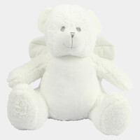 Soft plush angel. Contrast eyes and nose. Cream fabric wings. Cream coloured panel on tummy. Zip access on base for direct access onto the tummy for decoration. Removable inner stuffing. Can be embroidered or sublimation printed. Complies with EN71 European Toy Safety regulations. Remove all hang tags and their fasteners before giving these items to a child. Suitable for children of all ages.